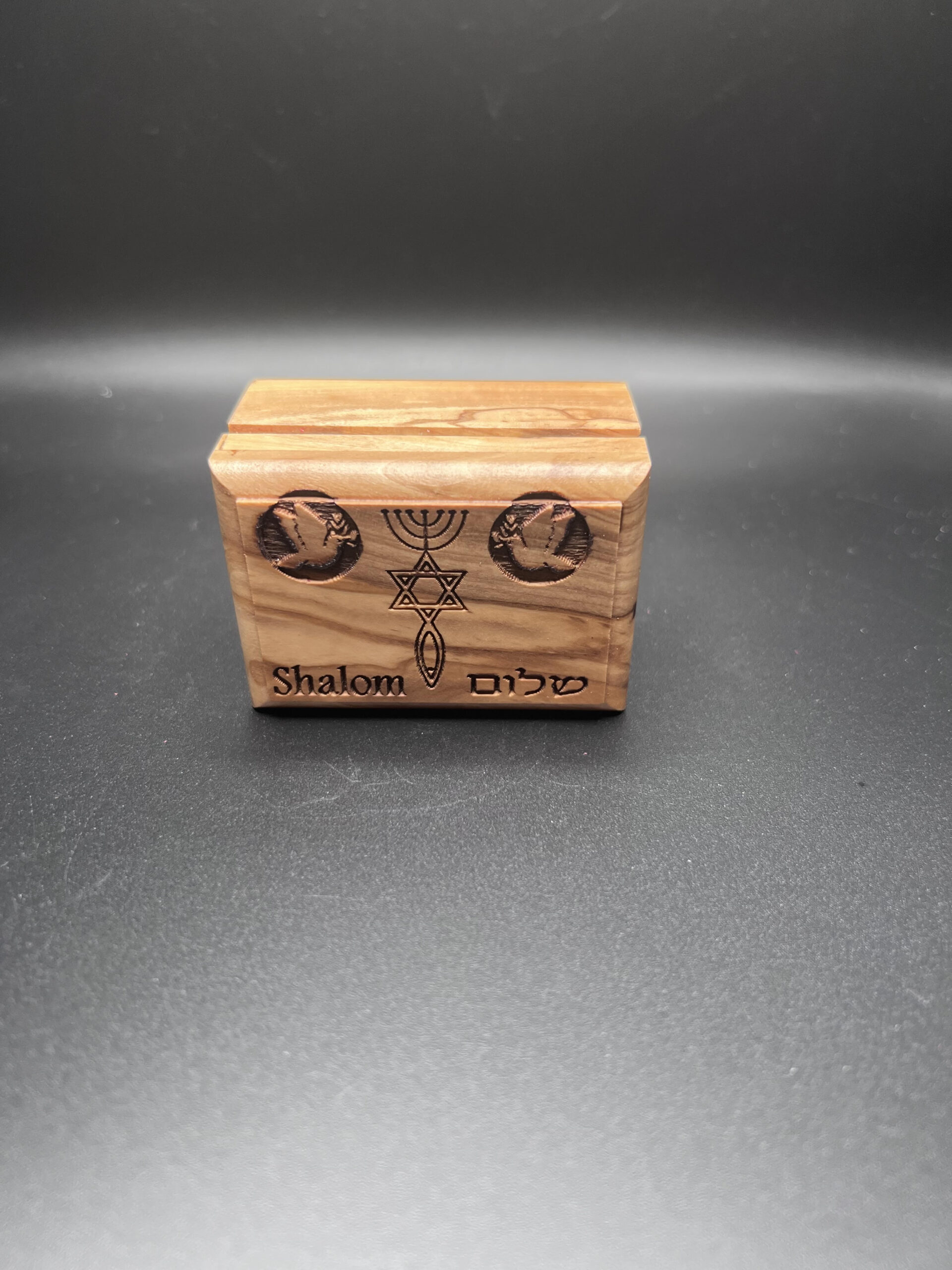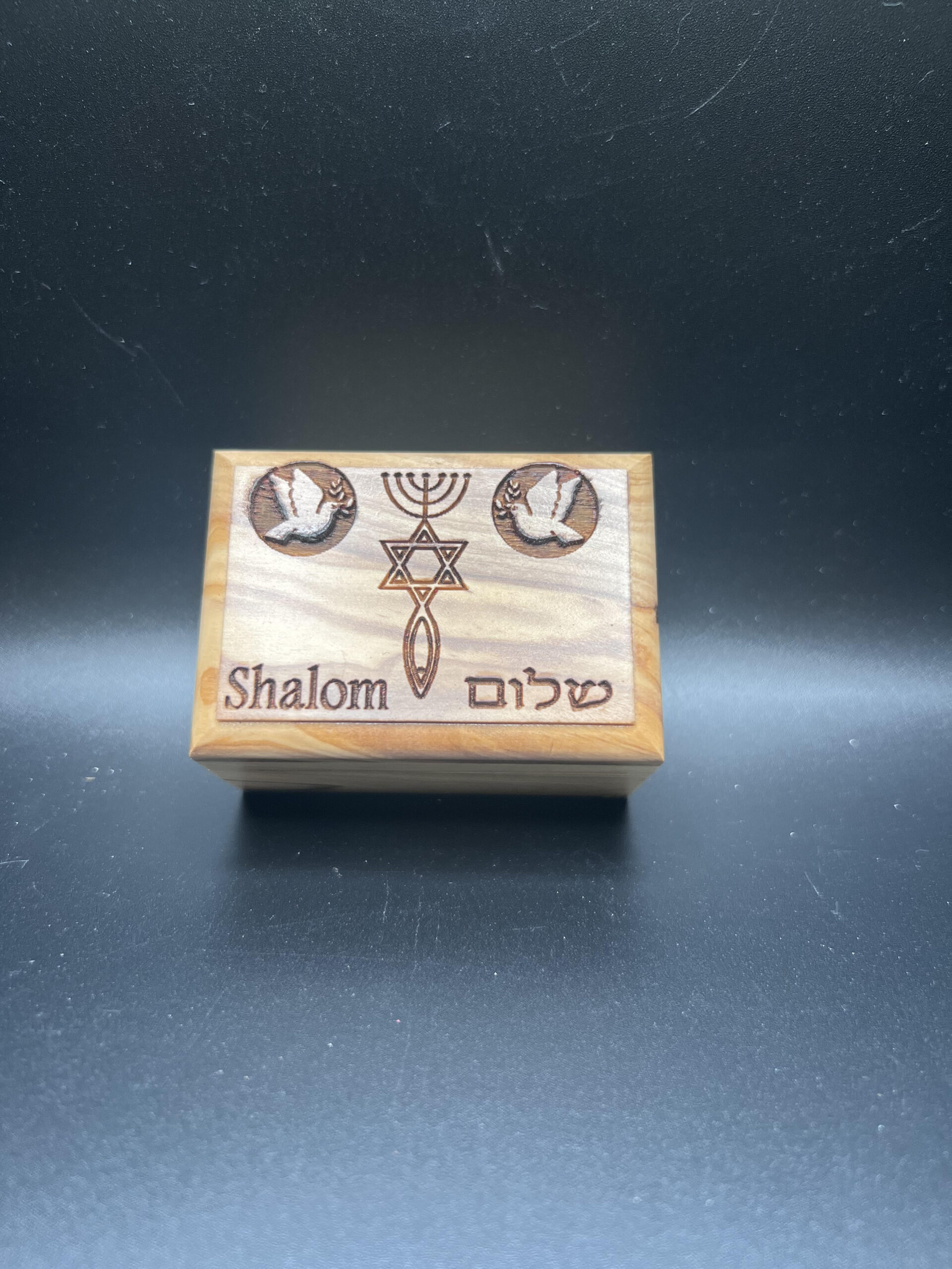One New Man Shalom in Hebrew with Doves – Olive Wood Box