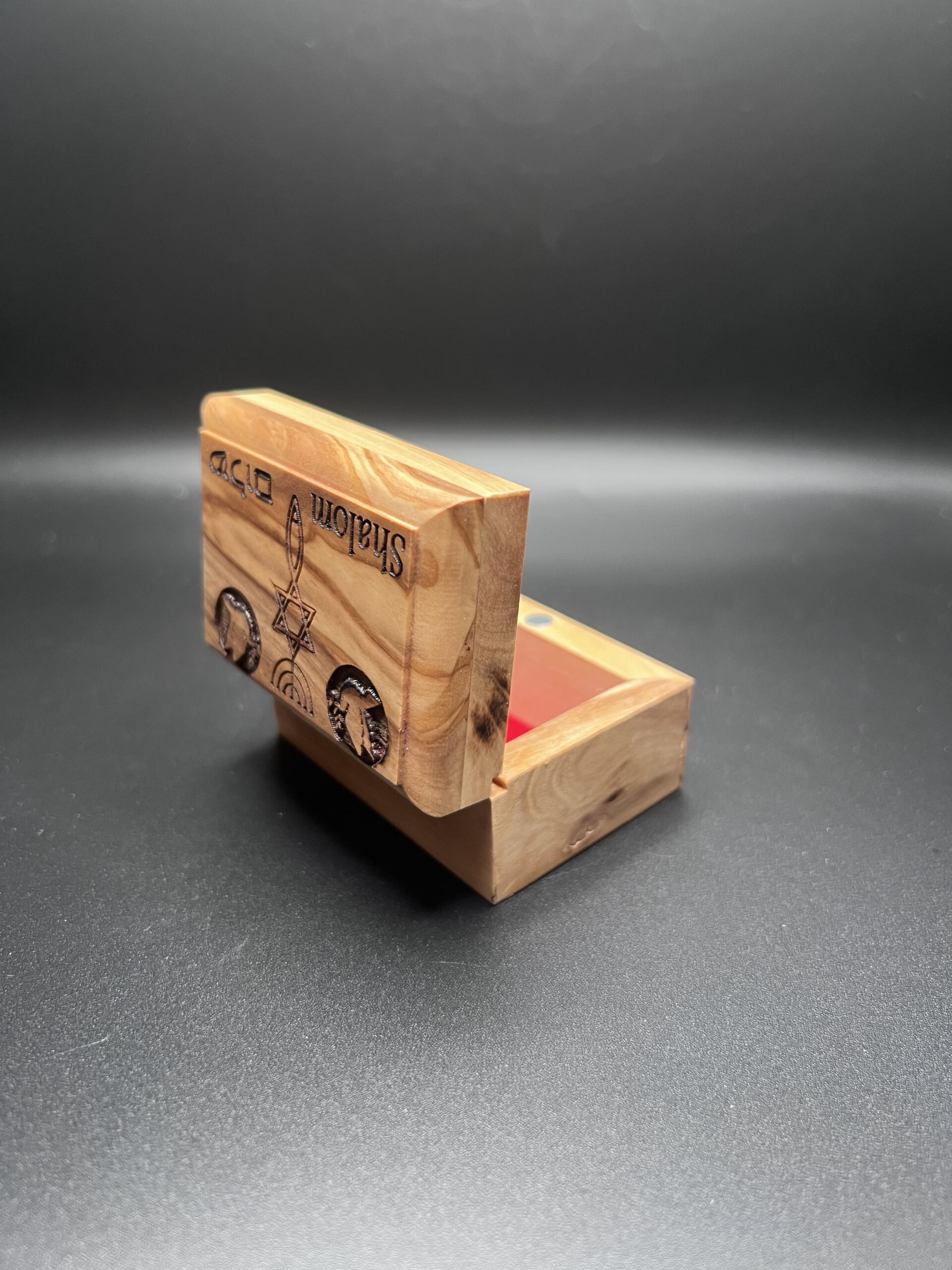 Engraved wooden jewellery box featuring the messianic ‘Grafted in’ symbol and the word ‘Shalom’.